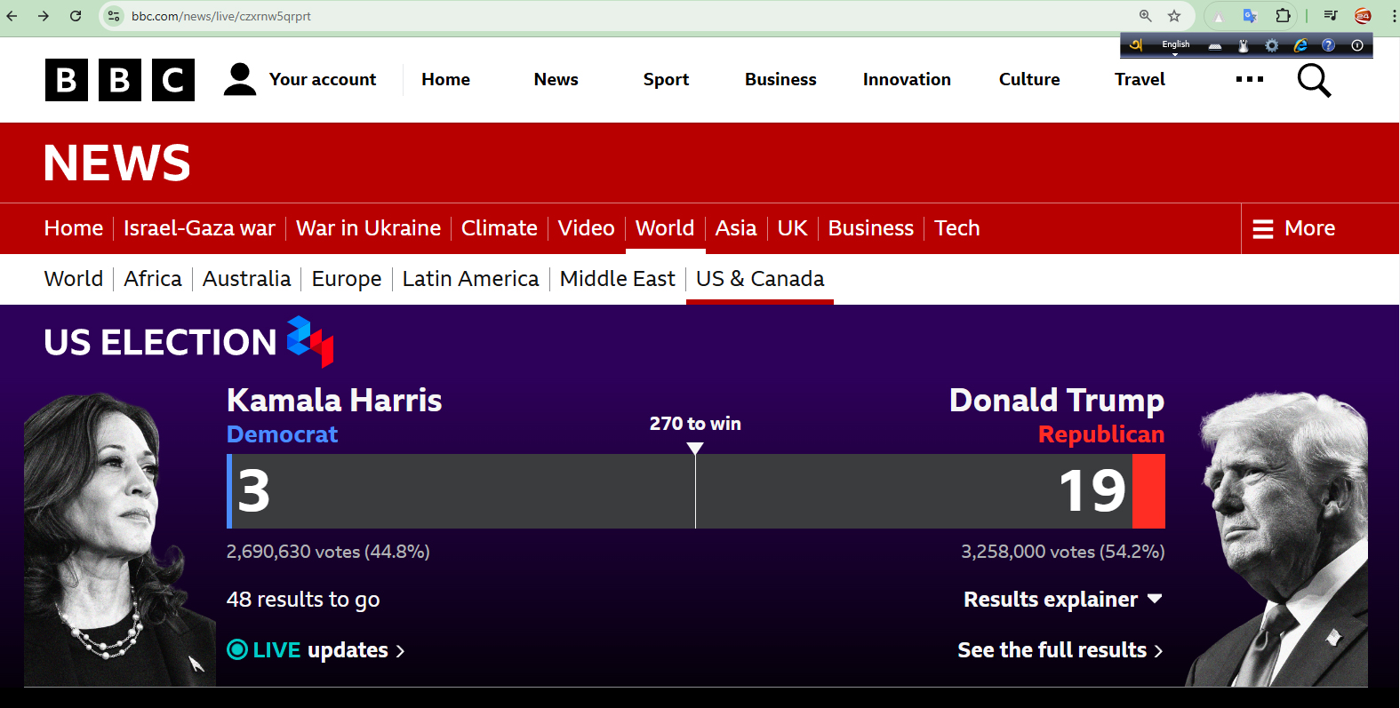এদিকে বাংলাদেশ সময় বুধবার (০৬ অক্টোবর) সকাল সোয়া ছয়টা পর্যন্ত গণনা হওয়া ভোটের ২৬ লাখ ৯০ হাজার ৬৩০ ভোট পেয়েছেন কমালা হ্যারিস, যা গণনা করা ভোটের ৪৪ দশমিক ৮ শতাংশ। অপরদিকে ট্রাম্প পেয়েছেন ৩২ লাখ ৫৮ হাজার ভোট, যা গণনা করা ভোটের ৫৪ দশমিক ২ শতাংশ।